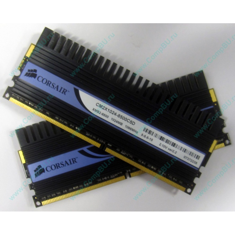 Два модуля памяти 1024Mb DDR2 Corsair Dominator CM2X1024-8500C5D XMS2-8500 pc-8500 (1066MHz) с чёрным радиатором. Напряжение 2.10V. Продаются парой, цена указана за комплект из двух модулей. По отдельности не продаются!
